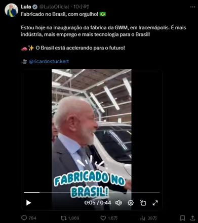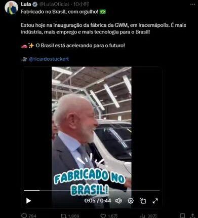 برازیل کے صدر لُولا نے ساؤ پالو کے ایراکیمابولس میں چین کے گریٹ وال موٹرز کے پلانٹ کی افتتاحی تقریب میں شرکت کی۔ لُولا نے سوشل میڈیا پلیٹ فارم ایکس پر پوسٹ کرتے ہوئے لکھا: "میڈ ان برازیل، فخر! اس کا مطلب ہے کہ برازیل میں مزید صنعتیں، مزید روزگار اور مزید ٹیکنالوجی آئے گی! برازیل مستقبل کی طرف تیزی سے بڑھ رہا ہے!”
